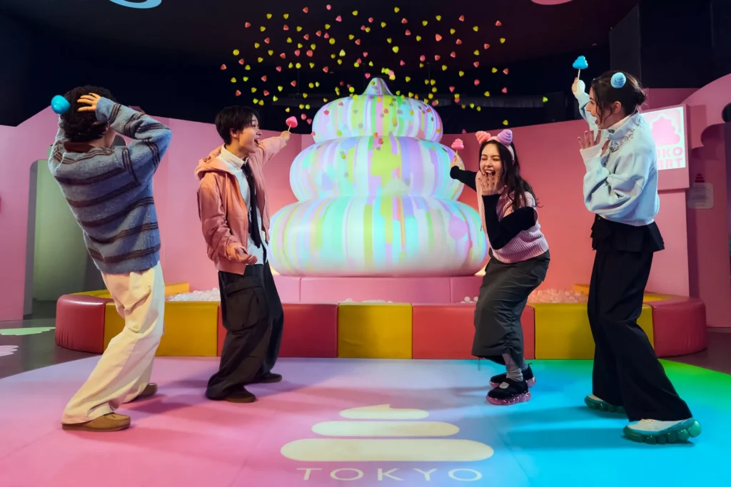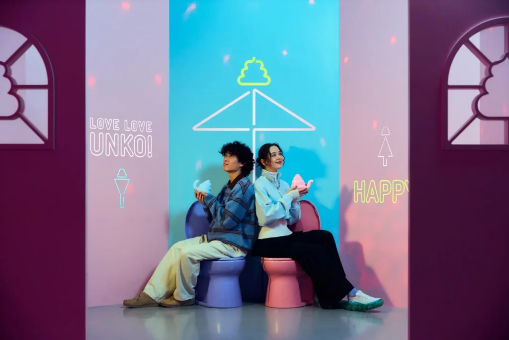 パステルカラーのうんこが大量に飛び交うフォトスポットです。お揃いのポーズでうんこカワイイ写真を撮りましょう。