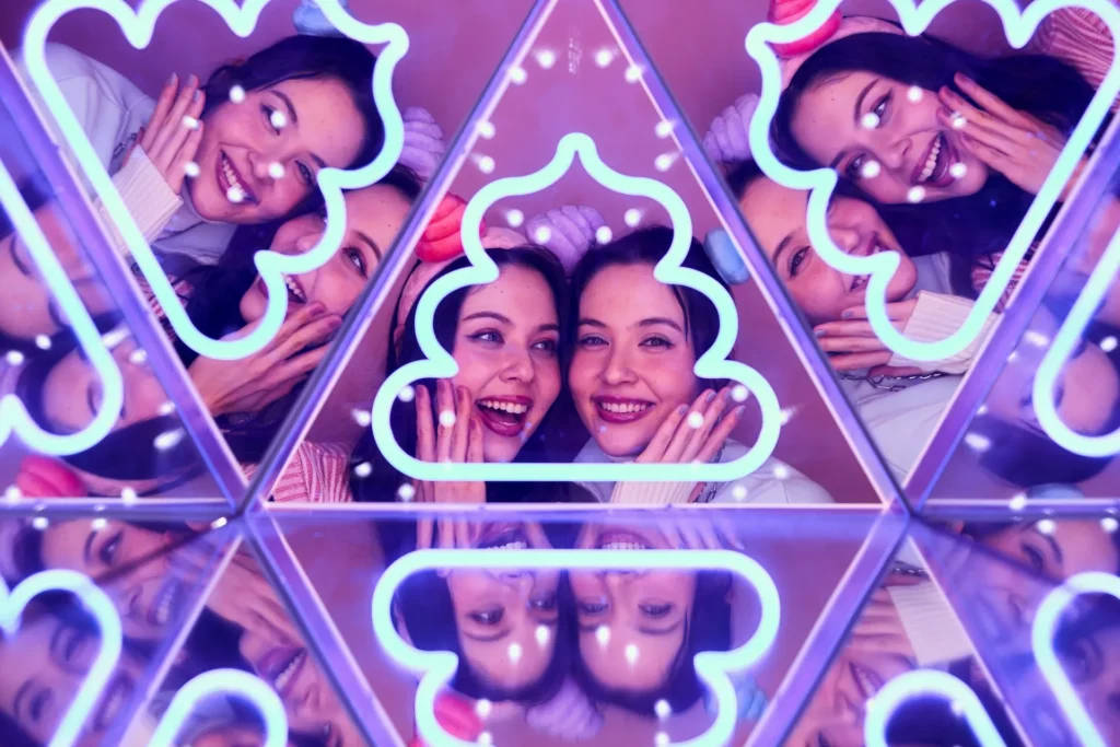 三角形の筐体を覗き込むと、まるで万華鏡のように、うんことあなたが増えていきます。2人で覗き込んで写真を撮ると、大好きな人とうんこがたくさん広がって幸せな気分になります。