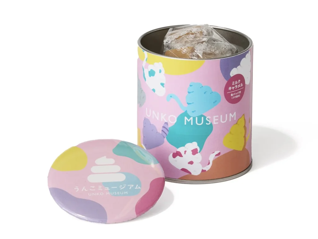 可愛い缶バッジ付きの、おいしいミルクキャラメルです。「うんこ動物」がデザインされており、食べ終わった後はお部屋に飾ることができます。