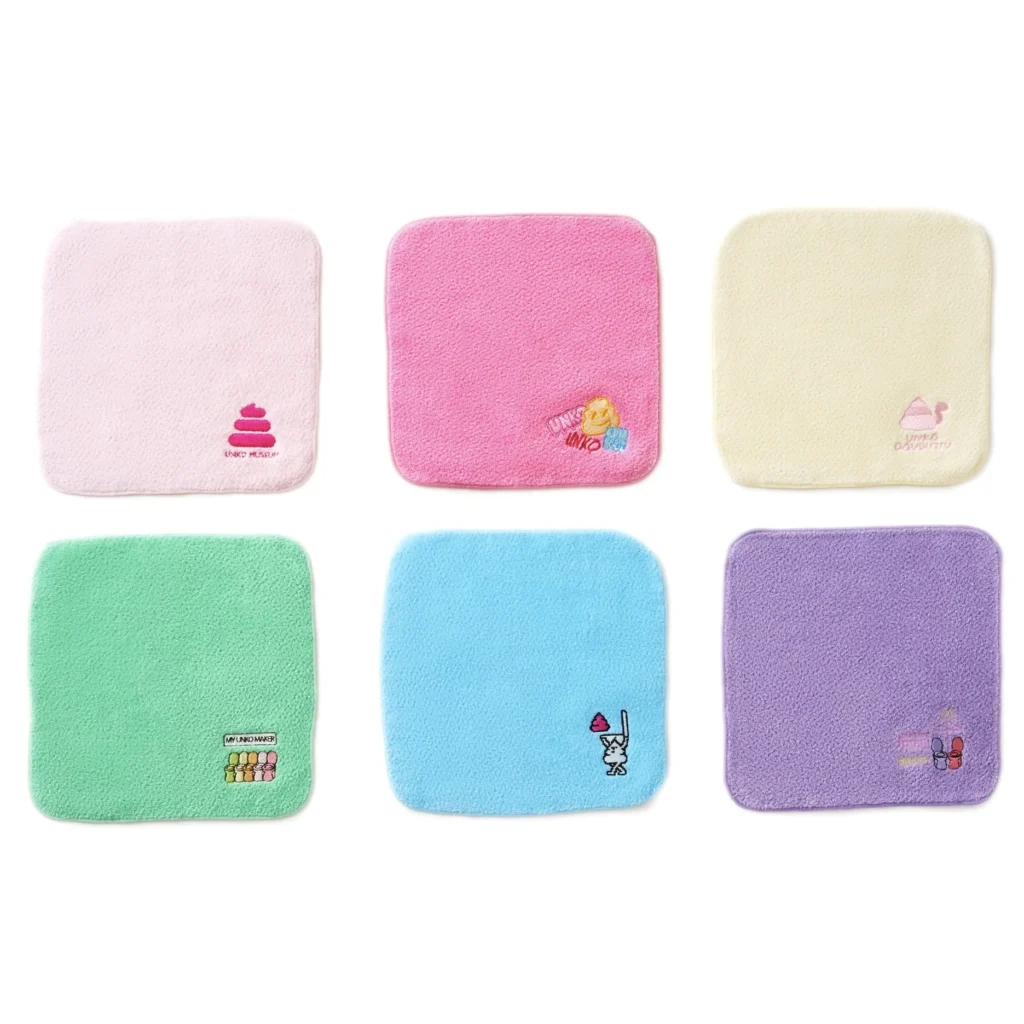 うんこミュージアムのモチーフ6種がふわふわの刺繍ハンドタオルに。手を洗った後は、このタオルで可愛く拭きましょう。